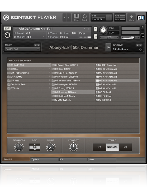 The right drum sound is only part of the equation. ABBEY ROAD | 50s DRUMMER provides a Groove Library full of beats and fills perfect for everything from rock and roll and country to jazz and R&B. A set of modern grooves is also included for producers looking to add some vintage spice to their contemporary sound.